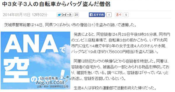 日本茨城縣警察總署在5月14日將築波未來市的一名僧侶逮捕,原因是這名僧侶被懷疑盜劫了4名女中學生放在車籃內的物品。