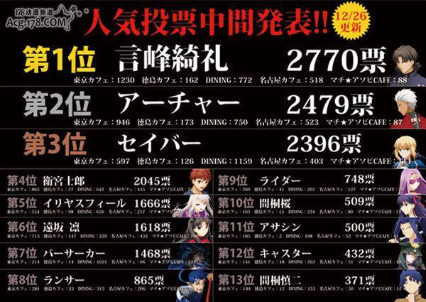 在ufotable Cafe舉行的以「Fate/stay night」中的各個角色爭奪聖杯為主題的人氣角色投票中,中間冠軍的得主實在有些令人大跌眼鏡。在本作故事中並不是很顯眼的言峰綺禮,居然以較大的優勢獲得了中間人氣首位(2770票)。而Archer以將近300票的劣勢位居次席(2479票)。急追第二名的Saber以不到100票的差距位居第三(2396票)。