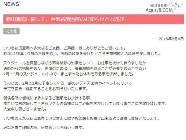 曾出演高坂穗乃果、森園立夏等人氣角色的新人聲優新田惠海所屬的事務所官網上宣布了新田惠海暫停工作的消息。自從去年12月以來,新田惠海開始感受到喉嚨有不適,經過醫生的診斷後確定是聲帶結節,無法繼續工作。因此新田惠海將會暫停2月份3月份的工作。是否會影響到今年上映的「LoveLive!劇場版」還不得而知。希望她能夠早日康複,繼續為我們帶來更好的配音作品。