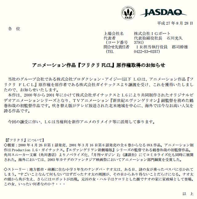 近日,Production I.G于官方網站發布公告,已從GAINAX處購得知名OVA動畫《FLCL》版權,並表示I.G有權利進行新動畫創作,或許預示著這部被稱作宅社最高峰的經典作品有望推出續作或重制版。