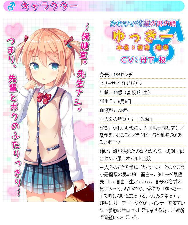 第二段劇情:由于約定一起下學,幸來到前輩的教室,結果發現前輩昏昏欲睡,為了幫助前輩入眠可愛的男孩子幸就幫前輩數綿羊,然而數著數著老師來了……最後還收錄了丹下櫻對這次配音工作的感受,其實從 CD 的封面來看是個「畫個萌妹子硬說長把」的設定,在丹下櫻的聲線加持之下只怕是有人把持不住,這款 CD 將在 6 月 1 日發售,售價 1296 日元。