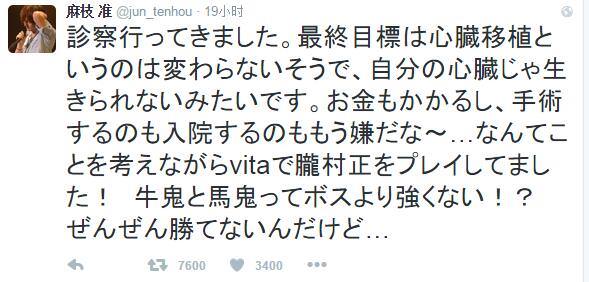 昨日,麻枝准在 twitter 上說了自己的複查結果進行心髒移植還是最徹底的解決方法,現在麻枝准的心髒好像難以維持他的生命。不過面對這麼嚴重的病情麻枝准本人則很豁達,還說自己為了治病花了很多錢也討厭長時間住院了,現在麻枝准還在 PSV 上玩朧村正解悶。
