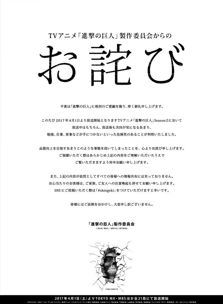 預計在4月1日開始播出的動畫《進擊的巨人》第二季的制作委員會,通過報紙“日本經濟新聞”公開了一封道歉信。在道歉信中,官方表示由于太過追求品質,可能會導致因為期待動畫的播出而讓人無法專心進行學習、工作、家務等情況的發生。在向大家表示歉意的同時,希望大家在觀看時做好心理准備。