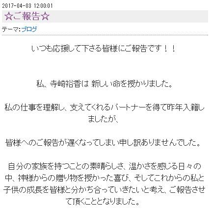 根據聲優寺崎裕香官方博客消息,在去年找到理解自己工作並願意支持自己的丈夫的聲優寺崎裕香,目前宣布已經懷有身孕。