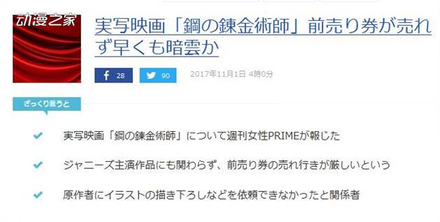 某業內人士指出:之前《JOJO的奇妙冒險:不滅鑽石 第一章》的票房只有8億日元。現在業界內有不少人覺得《鋼之煉金術師》也將會有同樣的失敗。