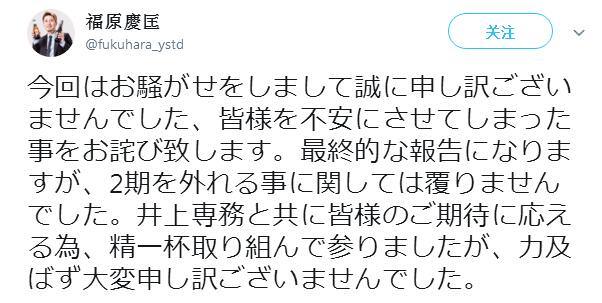 在推文中,福原慶匡先是對引發了這一連串的事情表示了歉意。之後稱雖然自己和KADOKAWA井上伸一郎董事長為滿足大家的期待而盡力了,但第二季正式確定將剔除八百萬制作公司。
