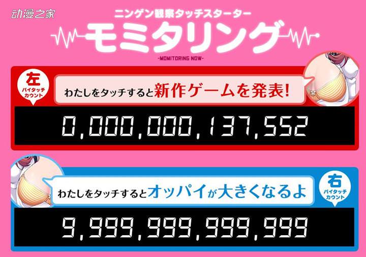 10日,D3 Publisher又在官網上公開了一個名為“人類觀察計數器”的網頁,在這個網頁中點左胸是想要知道新作的消息,而點右胸是想要歐派變得更大。根據活動規則,哪一邊的點擊量先達到0818871,就實現哪一邊的願望。不過在沒過多長時間之後,這個計數器就被玩壞了,現在雖然兩邊都可以點,但顯示的數字已經不正常。