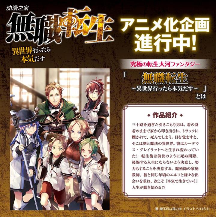 《無職轉生-到了異世界就拿出真本事-》最早是在小說投稿網站“成為小說家吧”上連載的異世界轉生類作品。本作講述了因交通事故被卡車撞死的無業大叔,在異世界重新開始新的人生的故事。在開始網絡連載後,本作受到了眾多網友的喜愛。之後MF文庫J(KADOKAWA)將本作商業化出版,目前輕小說刊行到20卷,最新的21卷預計將于25日發售。