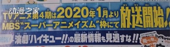 根據偷跑消息,TV動畫《排球少年》第四季預計將于2020年1月開始在MBS的“超級動畫時間”檔播出。雖然此消息並非官方消息,但本作的官方推特上,也寫有將在8月18日的在線直播中,將有與動畫新系列相關的重大發表。