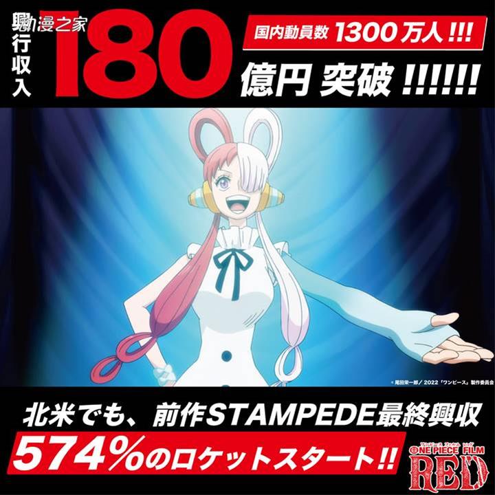 根據劇場版動畫《ONE PIECE FILM RED》的官方消息,本作在上映93天後,票房收入已經突破180億日元,觀影人數也突破了1300萬人。另外,本作在北美也取得了優異的成績。在11月3日至5日的三天時間里,北美票房已經達到了7515251美元,是上一作《ONE PIECE STAMPEDE》的574%。